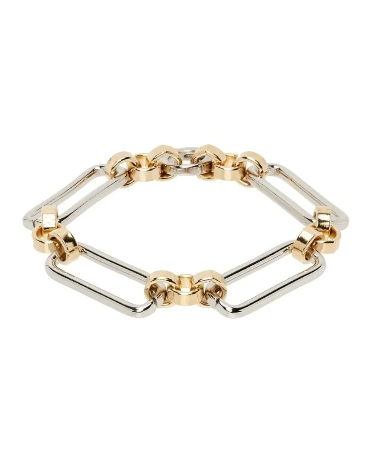 This stunning piece features a cable chain and rolo chain bracelet in platinum-plated brass and 14k gold-plated brass, giving it a unique mixed metal look that's both modern and timeless. The lanyard-clasp fastening ensures a secure fit, making it perfect for everyday wear.