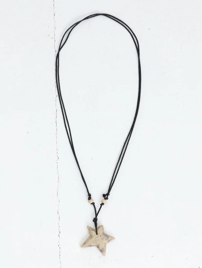 Appreciate the beauty the earth provides with this hand carved necklace that showcases a star made out of natural marble strung on a black cord rope.