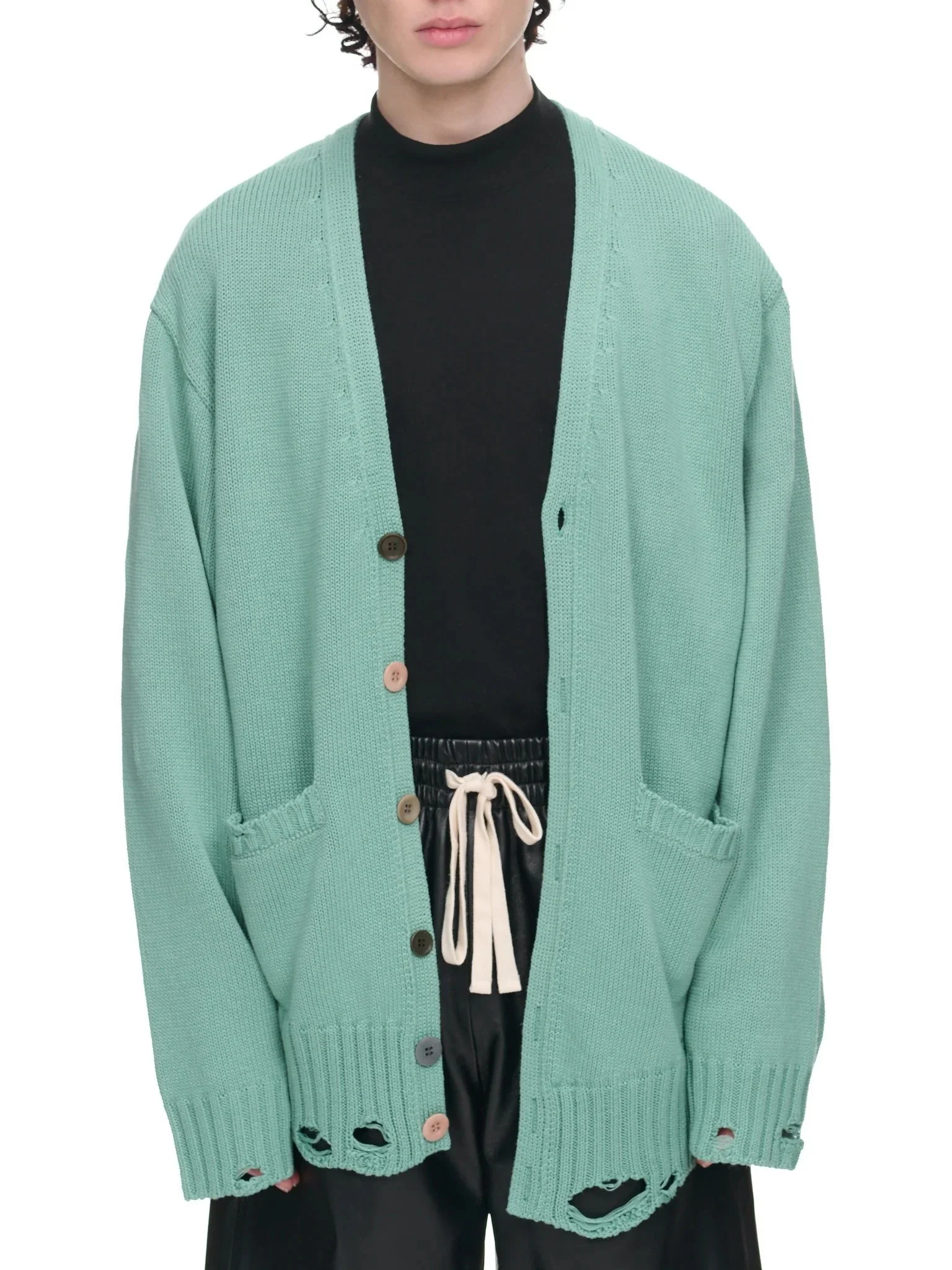 This Undercoverism cardigan in peppermint green is a standout piece that's both comfortable and stylish. Its oversized silhouette and distressed detailing make it the perfect choice for any fashion-forward man.